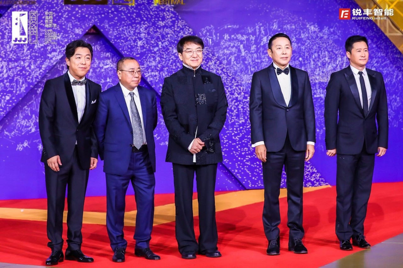 导演尹力、演员吴京、黄渤中国电影家协会主席陈道明、中国香港男演员、导演、动作指导成龙走上红毯。