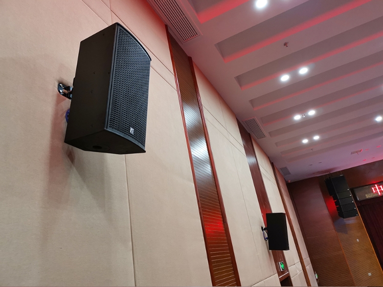 多功能厅的扩声系统选用了双8寸二分频曲线阵列扬声器VK208和单18寸超低频扬声器VK18B(每组4+1/只),该阵列扬声器具有声波导向相位塞专利技术,提高低音驱动器中低频的可用输出,增加灵敏度,提高声压级和改善指向性,提高音箱低音驱动单元水平及垂直分频点。